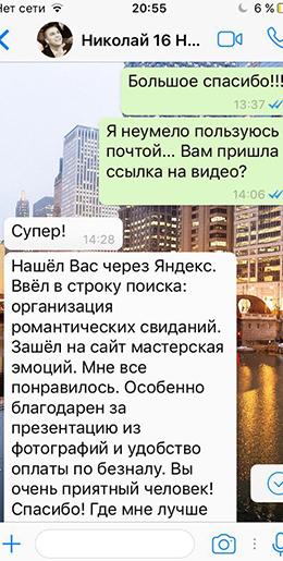 Прежде всего, мы лично или заочно знакомимся с клиентом и внимательно слушаем, что человек хочет, как он это хочет, для чего и почему. Один из самых главных моментов в хорошей и качественной организации предложения руки и сердца, романтического свидания или сюрприза – это правильно понять его желания и цели. Здесь нельзя упускать ни малейшей детали.